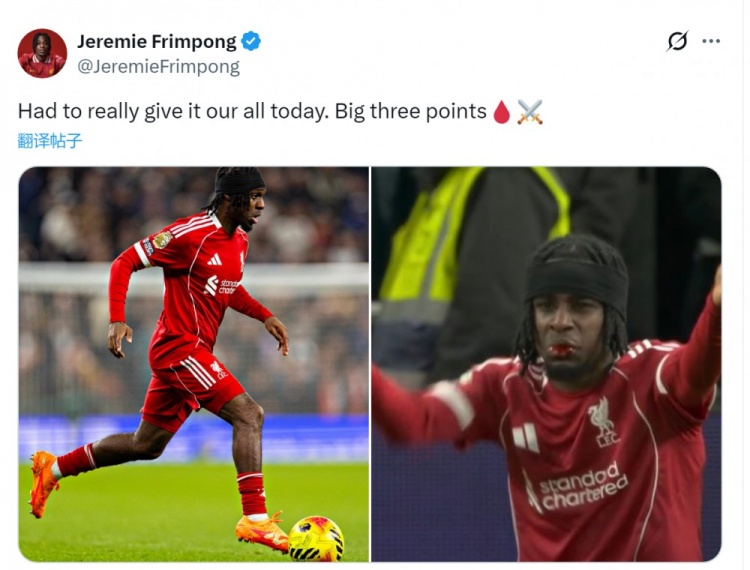 12月21日讯 利物浦边卫弗林蓬更新社媒动态,晒出嘴部流血的照片。