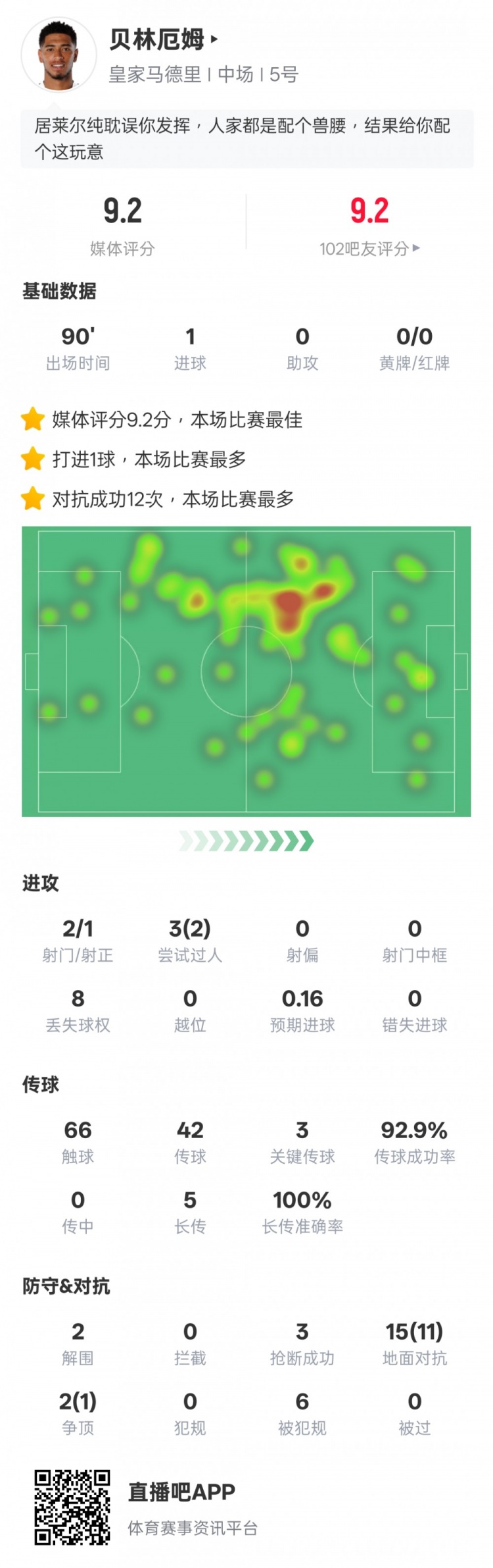 本场比赛,贝林厄姆贡献1粒进球,2次过人成功,3次关键传球,传球成功率92.9%,还有2次解围和3次抢断,12次对抗成功全场最多。
